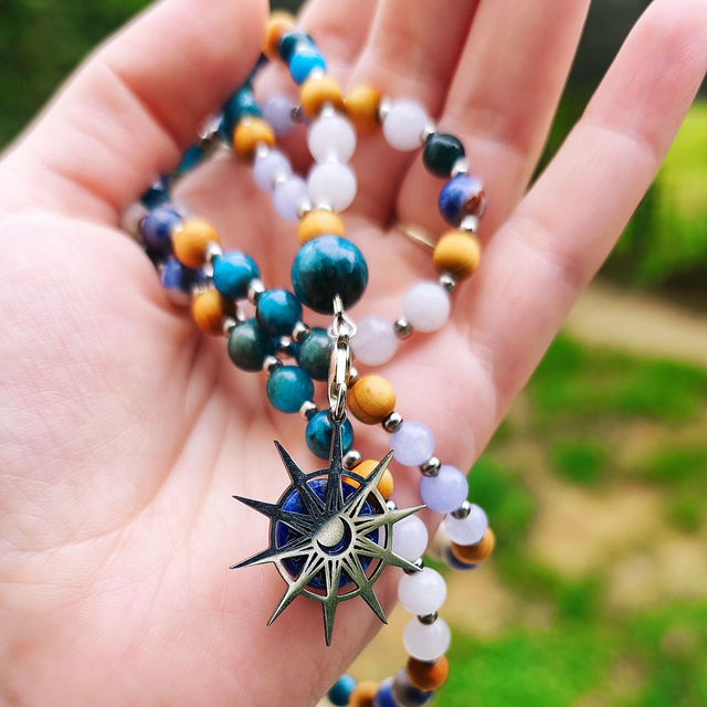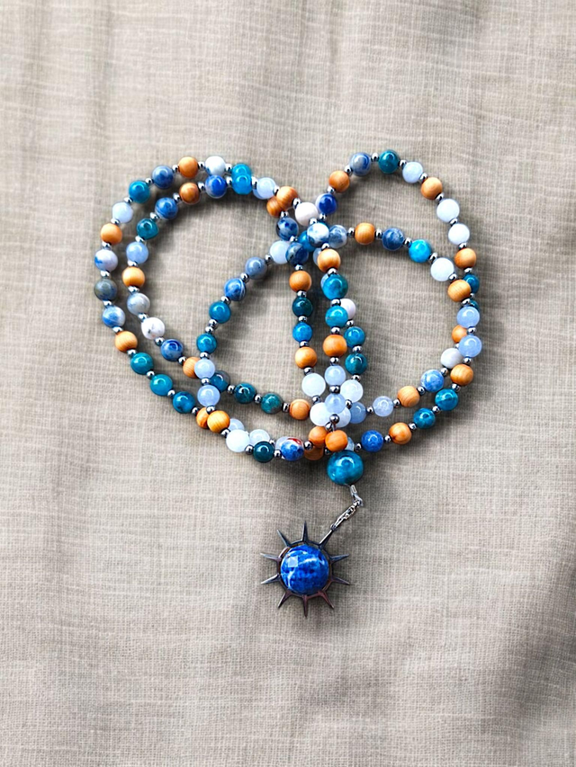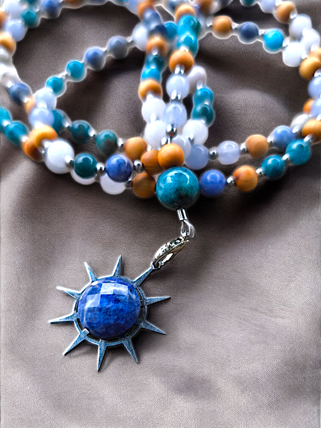 Composé de 108 perles (pierres & bois), il incarne la légèreté de l’air et la fluidité de l’eau. Ce mala t’accompagne dans les moments de recentrage, pour apaiser le mental, ouvrir l’expression et retrouver ton axe.