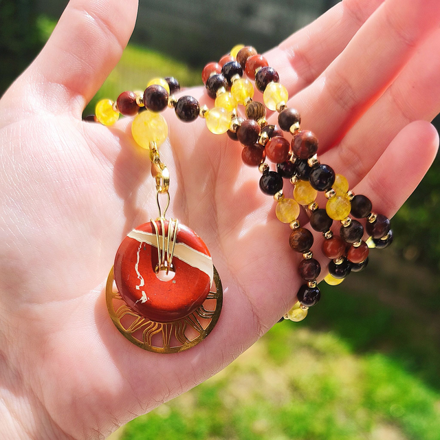 - Pierres (Citrine – Grenat – Jaspe rouge), bois et acier inoxydable doré
