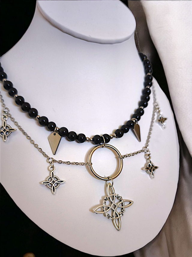 Dans la mythologie, Némésis veille à l'équilibre : elle punit l’excès, remet les compteurs à zéro, et frappe quand la mesure est dépassée. Cette version, ornée de nœuds de sorcière et d’onyx noir, incarne la protection rituelle. L’anneau central, toujours présent, accueille ici un symbole de magie nouée, entre sceau et charme ancien. Un collier pour celles/ceux qui portent en eux le pouvoir des sorts discrets… mais puissants.