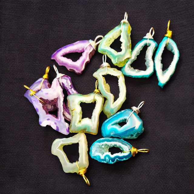 • Agate teintée, cuivre avec revêtement anti-ternissement, chaîne en acier inoxydable