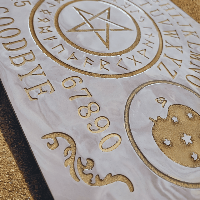 Ajoute une touche envoûtante à ton intérieur avec ce plateau Ouija décoratif, inspiré des instruments spirituels de communication avec l’au-delà. Fait main en résine acrylique, il est conçu pour l’ornementation et non pour la pratique.