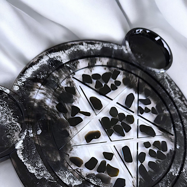 - Matériaux : Résine époxy + éclats d’obsidienne noire