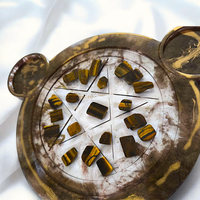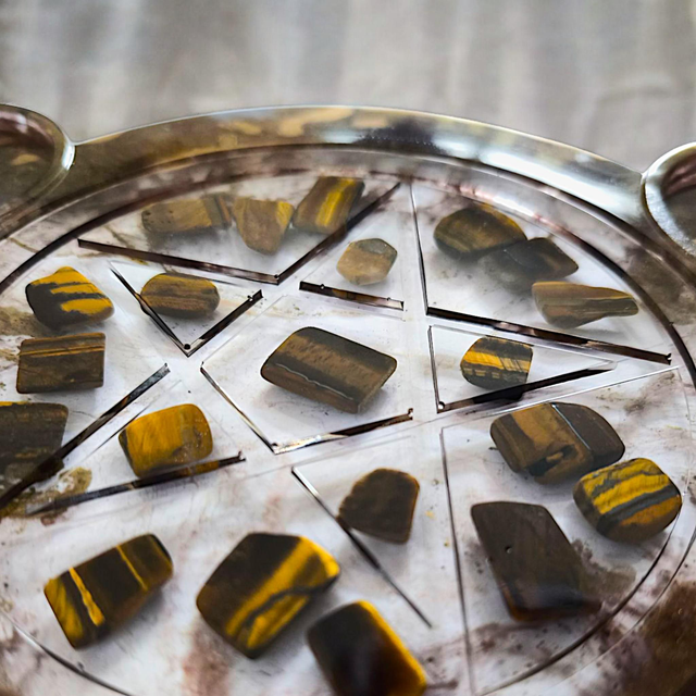 - Matériaux : Résine époxy + éclats d’œil de tigre